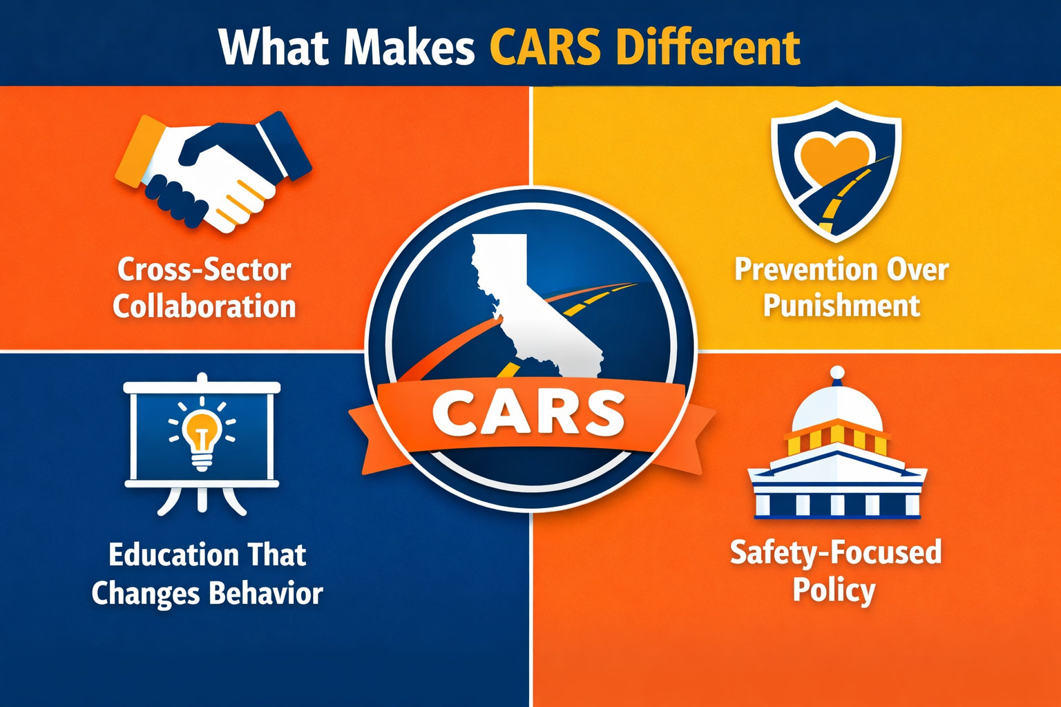 Today, CARS operates as a 501(c)(3) public-benefit organization dedicated to advancing meaningful traffic safety education and developing solutions that reduce crashes, prevent injuries, and save lives across California.