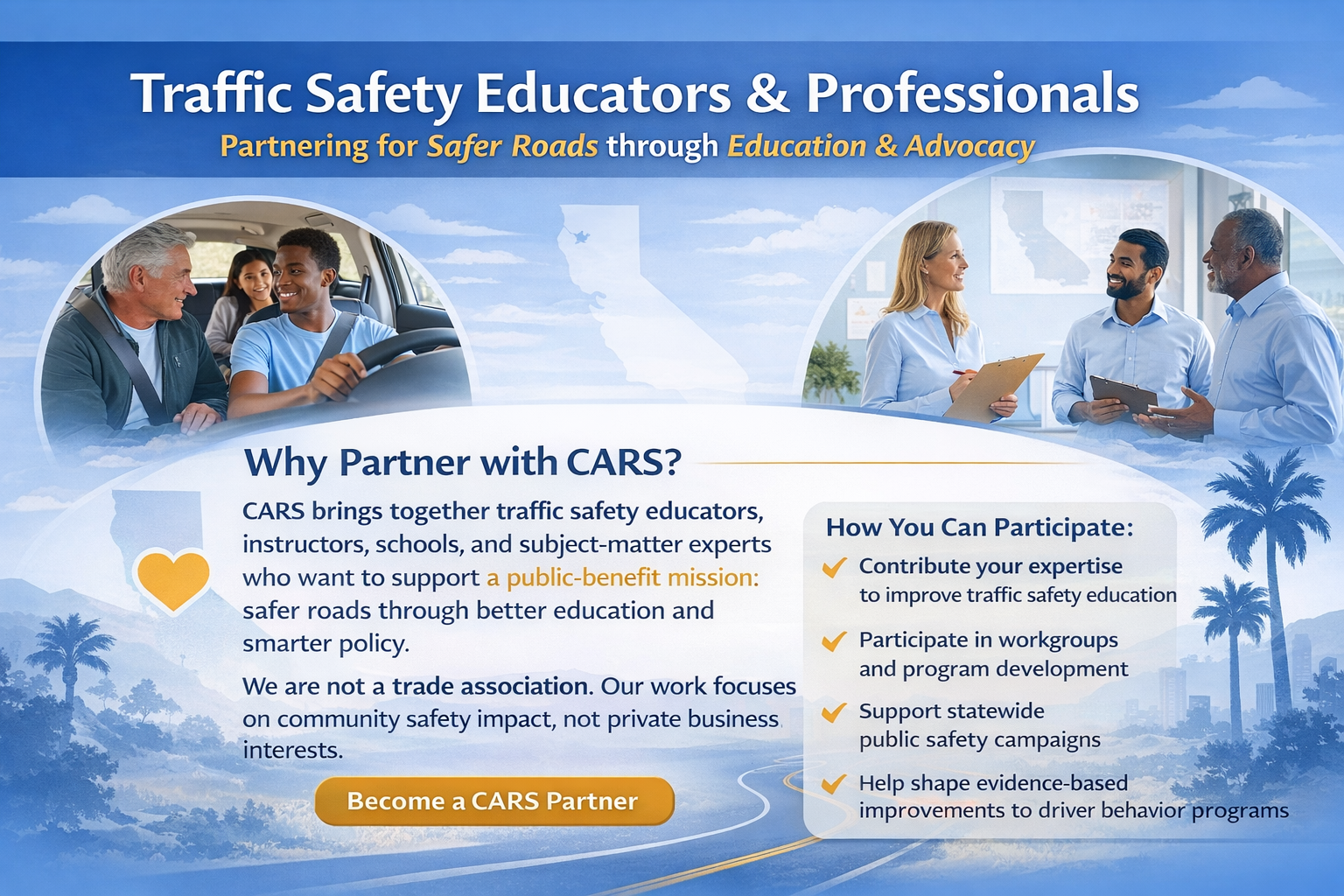 CARS partners do more than support programs — they help shape the future of traffic safety in California. Through collaboration, innovation, and responsible advocacy, our partners work to strengthen education, improve interventions, and advance smart public policy that protects communities statewide.